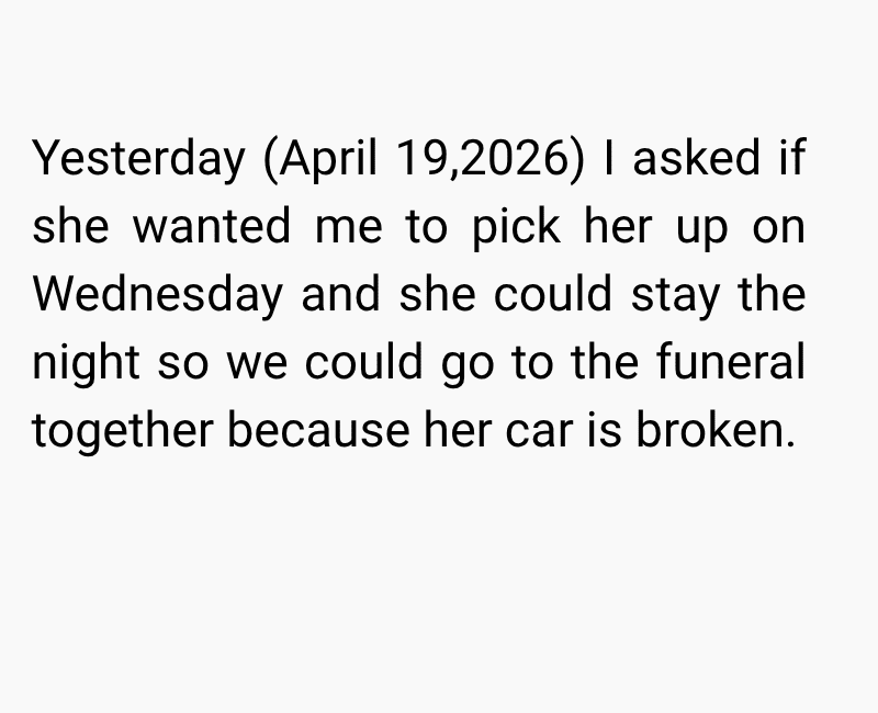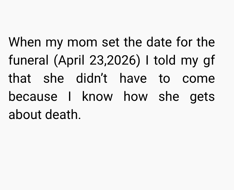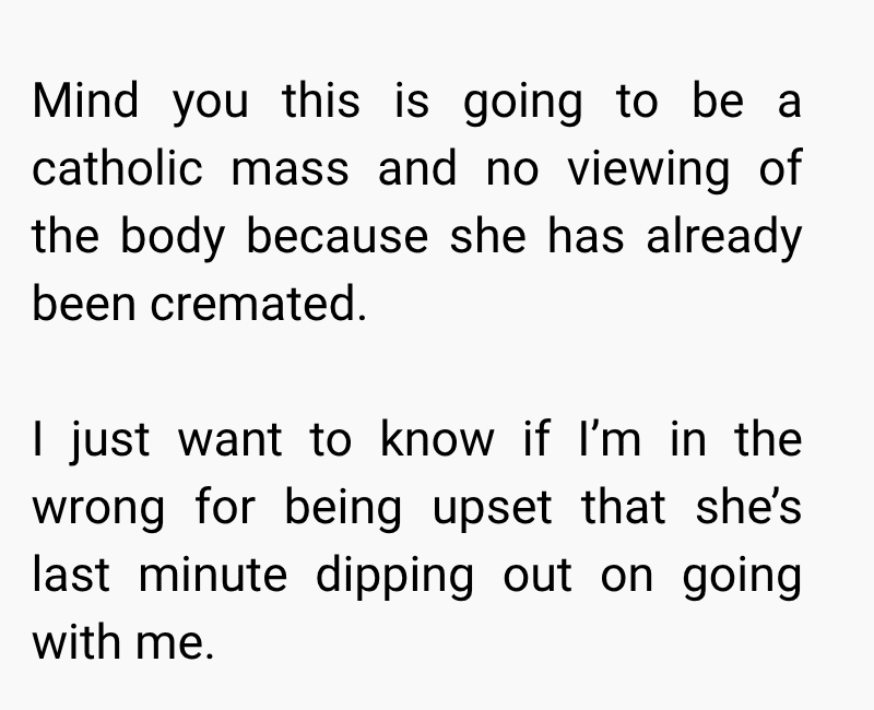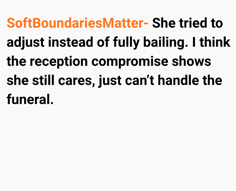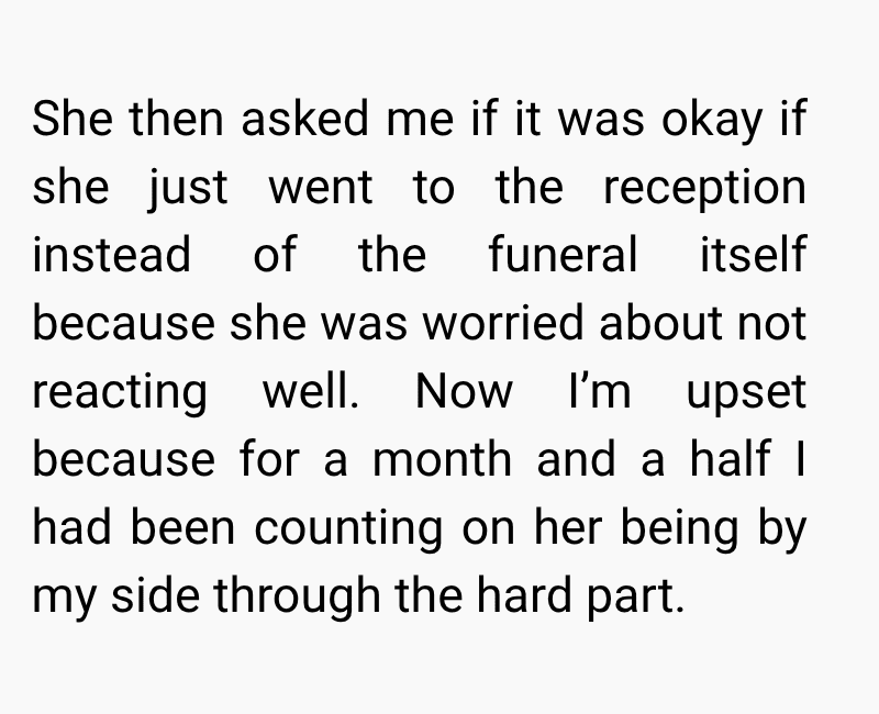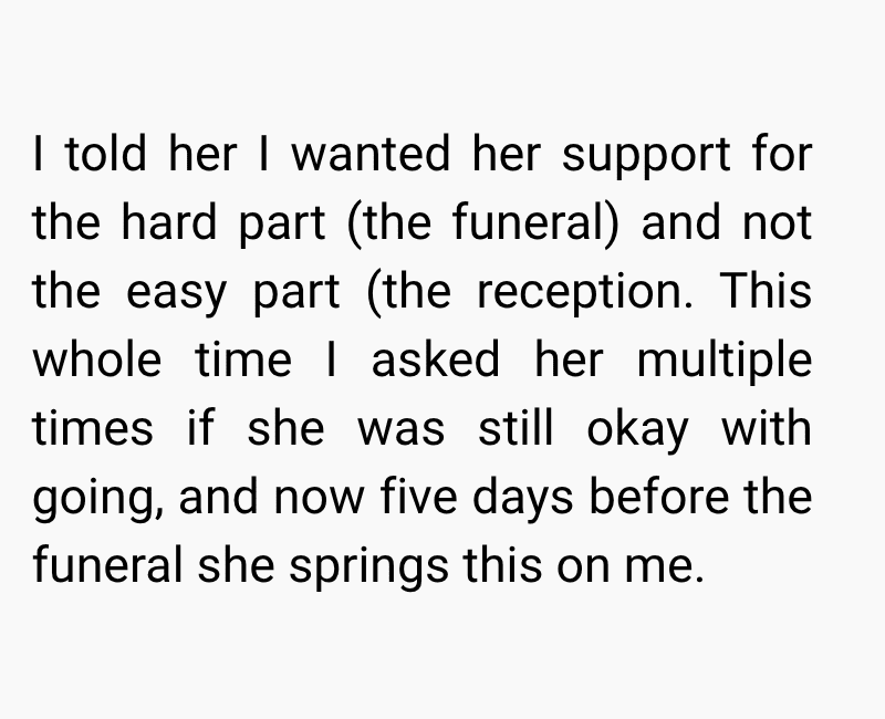 She agreed to attend, knowing how much it meant to me. However, just days before the funeral, she changed her mind and said she would only attend the reception instead of the actual service due to her own struggles with death and emotional triggers.