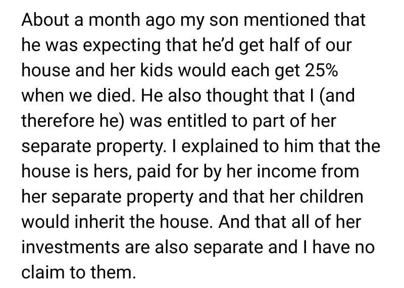 Married to a financially independent wife with significant separate assets, he has chosen a relationship built on fairness, transparency, and mutual respect rather than entitlement. But when his son learns that he won’t inherit the family home or his stepmother’s wealth, disappointment quickly turns into anger.