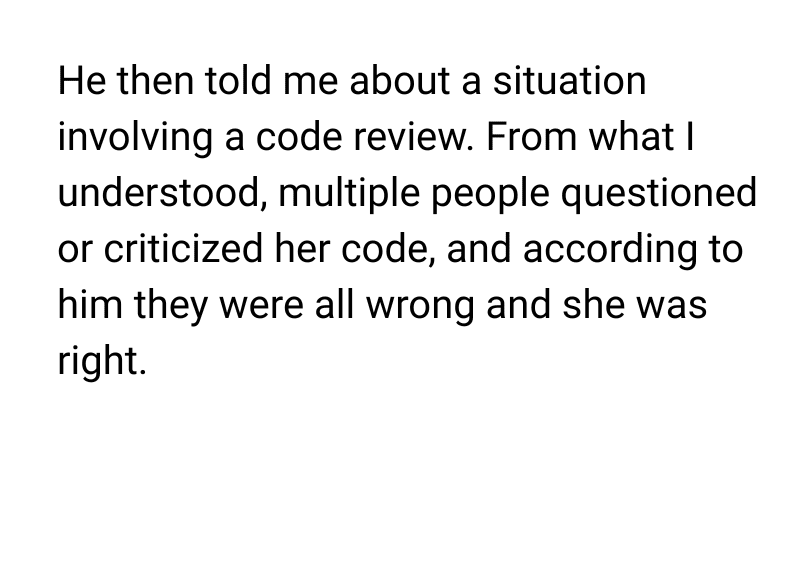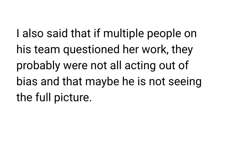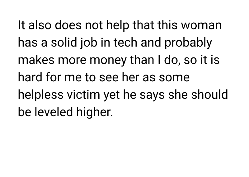 My boyfriend works in tech, and over the past few weeks, he’s been sharing stories about a female coworker whom he believes is consistently treated unfairly by their colleagues. He praises her intelligence, insists that others misjudge her work, and has even become visibly emotional while recounting her experiences.