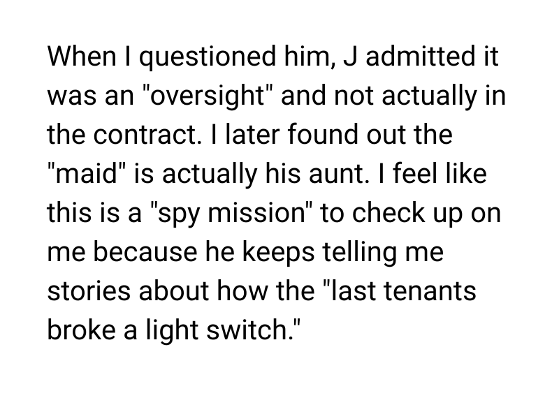 From the start, her landlord insisted on a “mandatory” monthly maid service, which she later discovered was actually his aunt. Concerned that this was less about cleaning and more about monitoring her, she refused the maid.