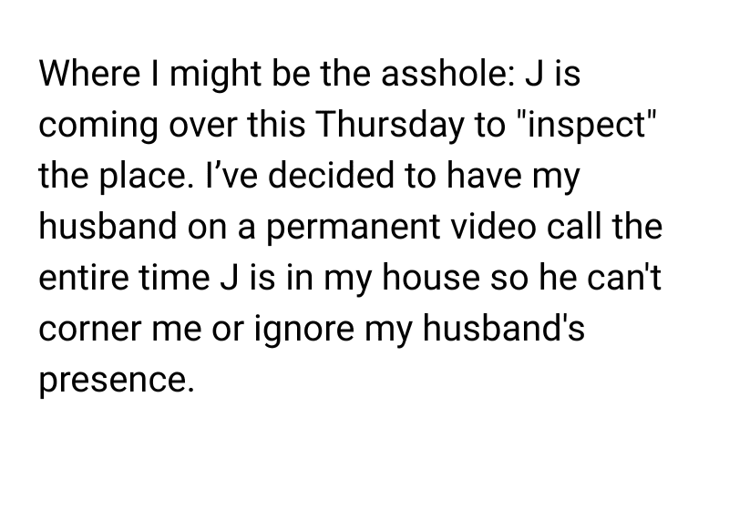 Feeling uncomfortable and potentially vulnerable, she decided to have her husband on a permanent video call during inspections and also set up a security camera. The situation raises questions about boundaries, privacy, and reasonable precautions: is she being overly protective, or is she simply standing up for herself.