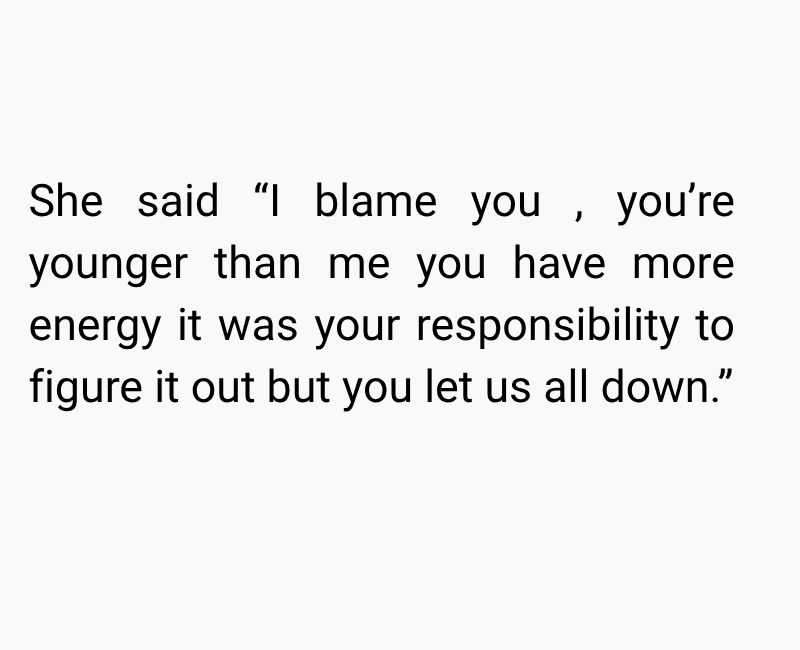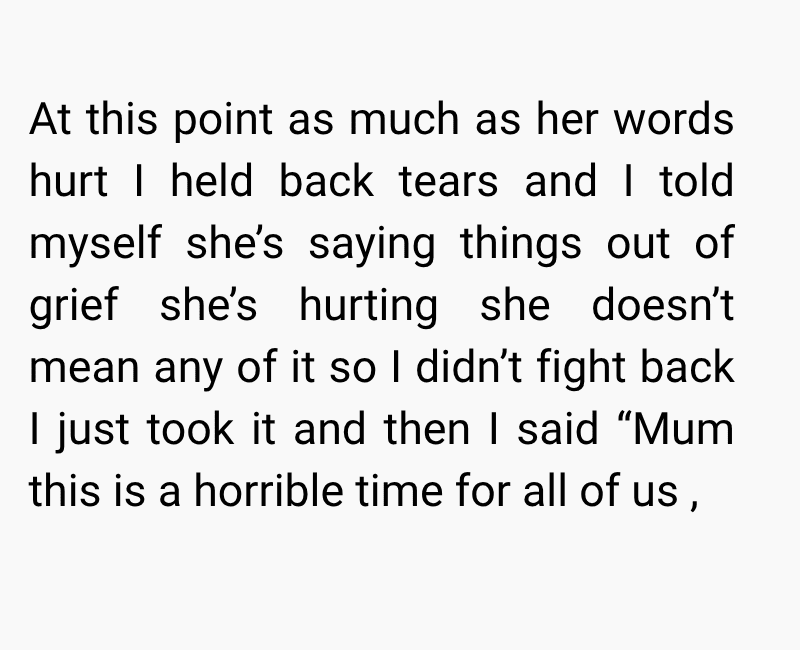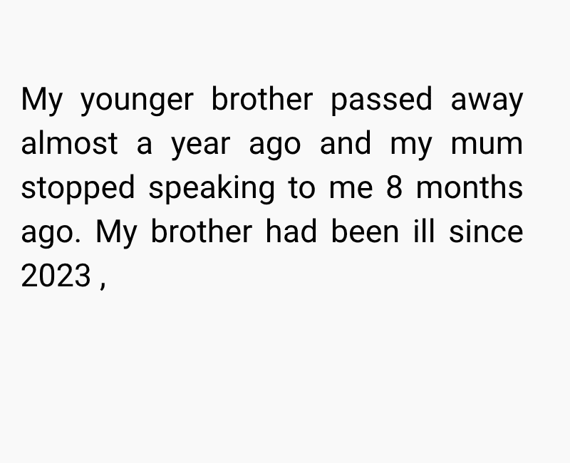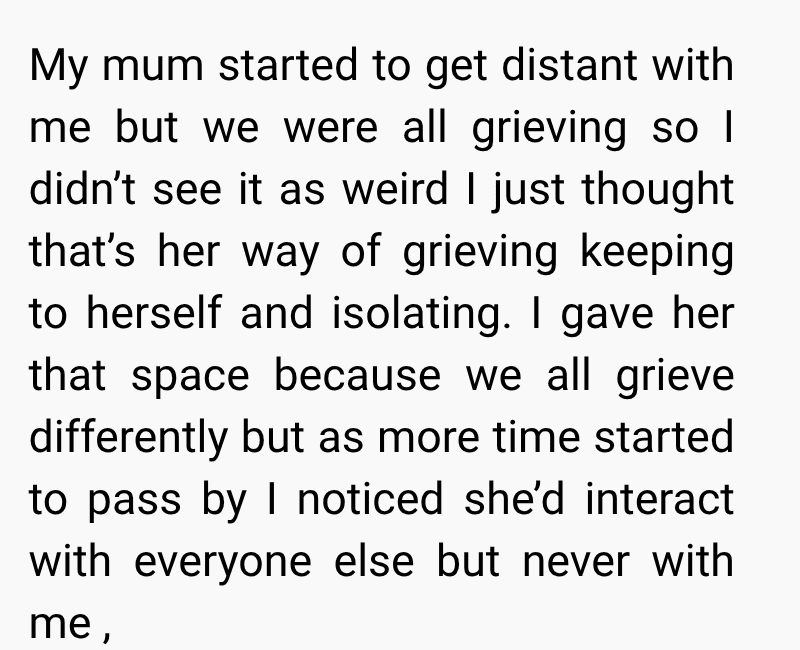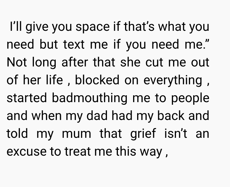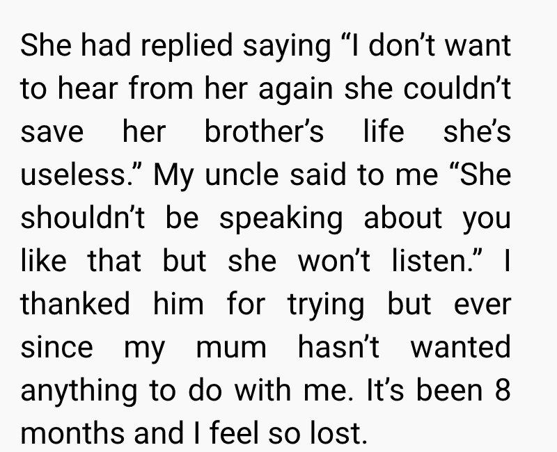 While I was trying to cope with the loss, my mum began to distance herself from me. At first, I thought it was just her way of grieving, but things took a painful turn when she told me she blamed me for not doing enough to save him. Since then, she has completely cut me out of her life, leaving me grieving two losses at once.