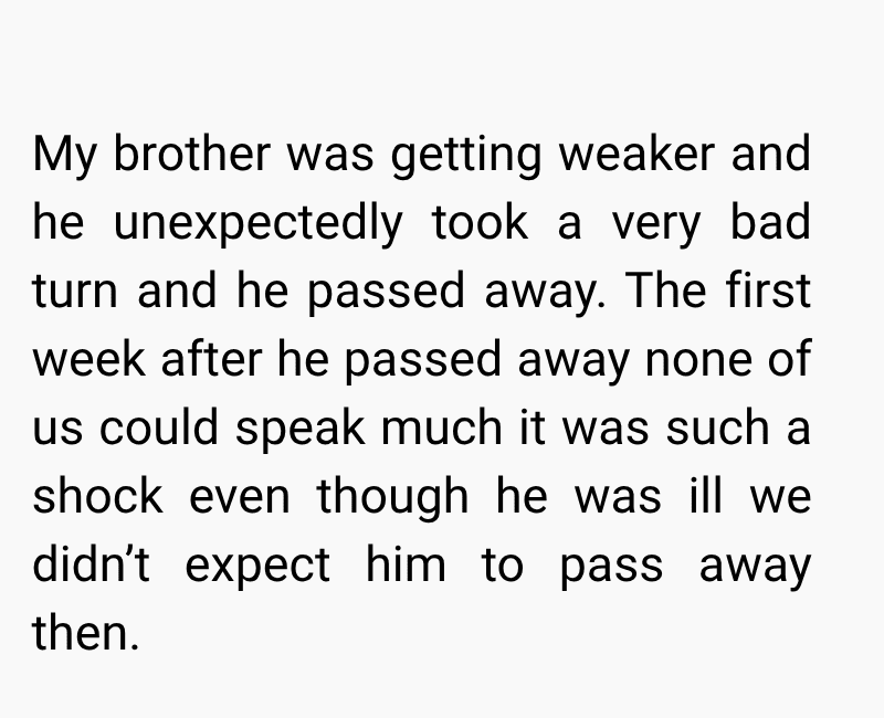 Now, all I can do is accept what I cannot control and focus on healing in my own way. I still hope that one day she might see things differently and find her way back, but I can’t keep holding onto that hope at the cost of my own well-being. For now, I’m learning to live with both grief and distance, trying to rebuild my life while carrying the love I had for my brother forward.