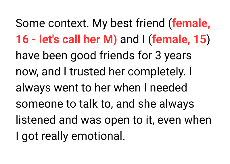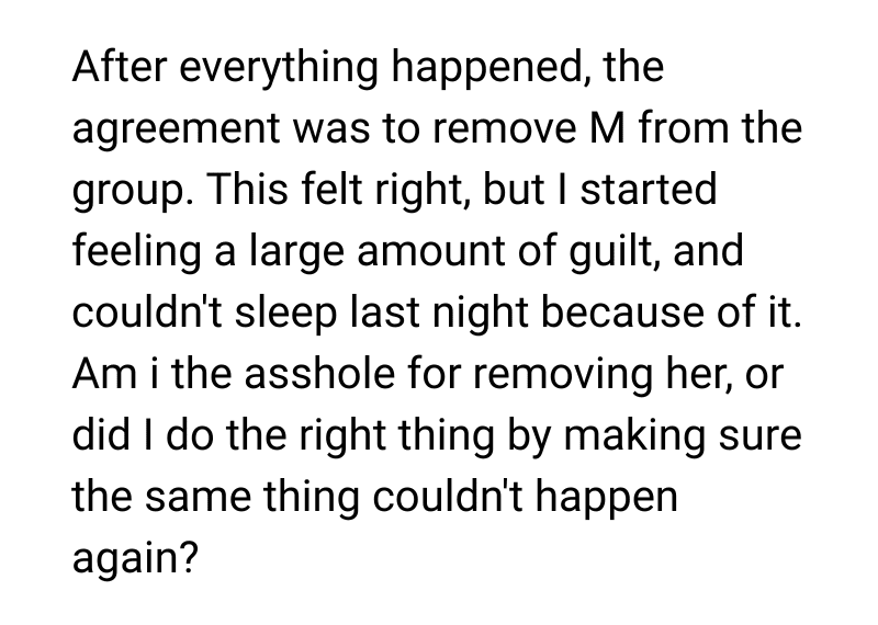 That shook me in a way I still can’t fully explain. What followed was anger, guilt, and a choice that none of us wanted to make. Now I’m left wondering if protecting someone else meant betraying her. So here it is: Am I the asshole for removing my best friend from our group?